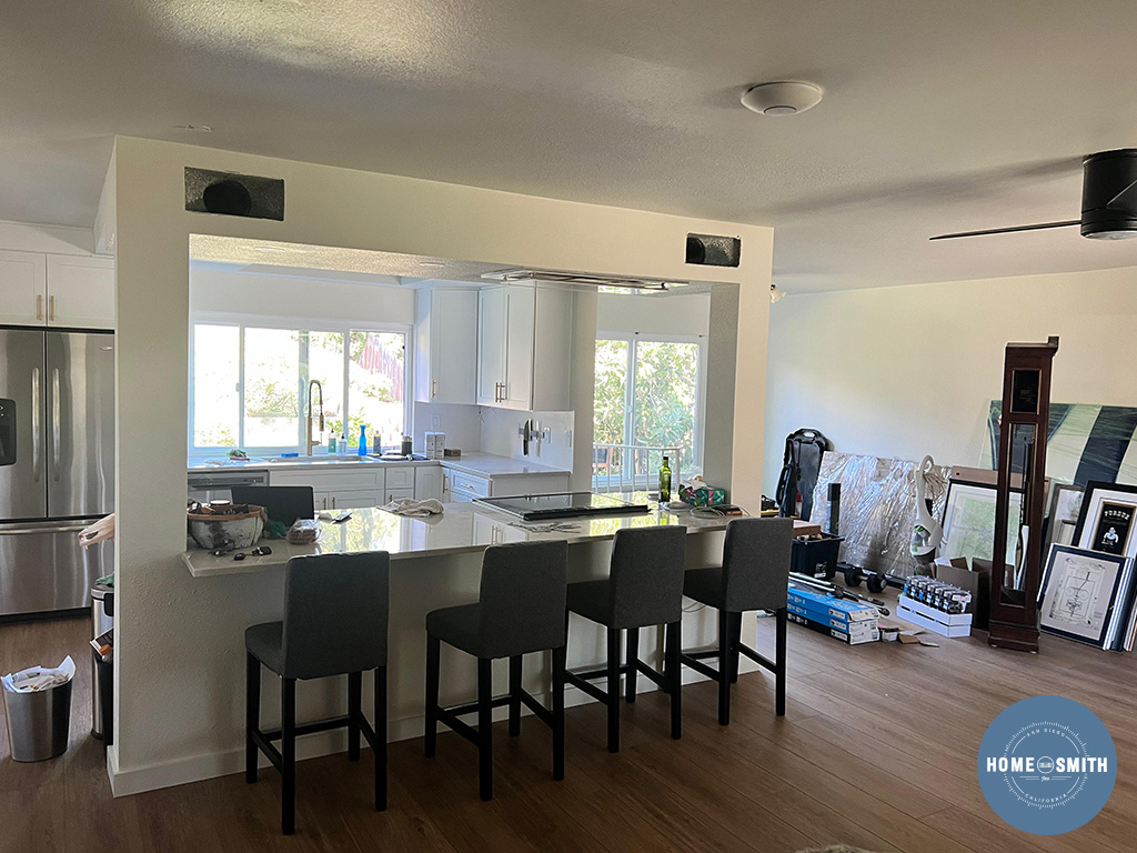 Removed a bulky bearing wall in Poway and replaced it with a flush-mounted ceiling beam—creating a clean, open transition between kitchen and living space.